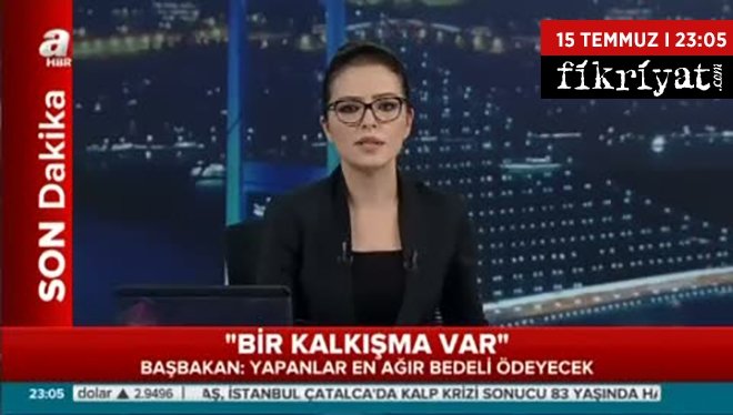 15 Temmuz I 23:05 :Başbakan Binali Yıldırım önce NTV, akabinde A Haber televizyon kanallarının canlı yayınlarına bağlanarak yaptığı açıklamada, "bir kalkışma girişimi"nin olduğunu belirtti. Yıldırım, "Bu girişime izin verilmeyecektir. Bunu yapanlar en ağır bedeli ödeyeceklerdir. Askerin içerisinde bir grubun kalkışması söz konusu." dedi.