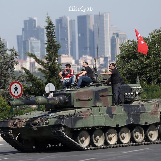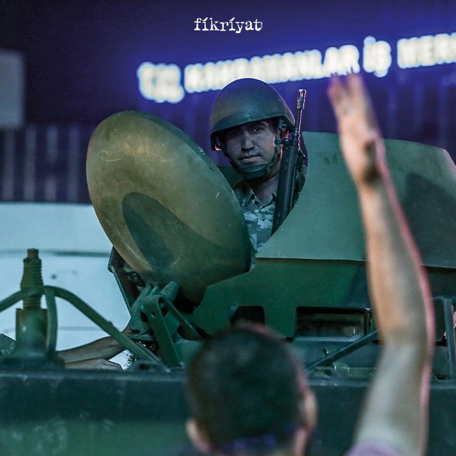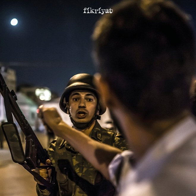 Askeri kalkışmaya direnen bir sivil ve ona karşı koymaya çalışan bir asker.