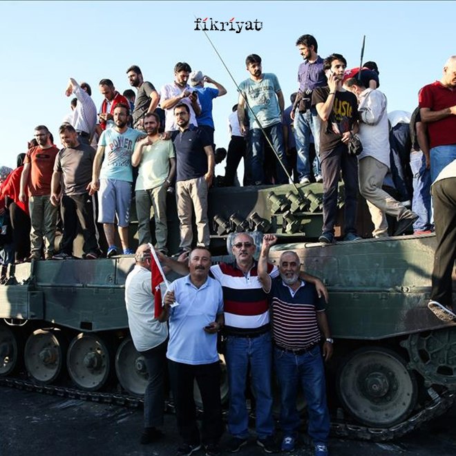 15 Temmuz gecesinin sabahında ele geçirilen bir askeri aracın önünde poz veren vatandaşlar.