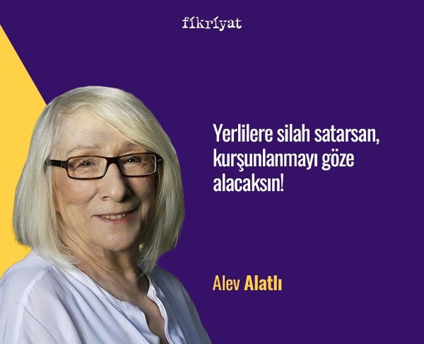 Fikir dünyasının tanınan simalarından biri olan merhum Alev Alatlı, Filistin davasına yaptığı katkılarla ön plana çıkmakta. Alatlı; yazar, akademisyen, sosyolog, köşe yazarı ve bir ekonomisttir. O, Türk ve İslam dünyasının Batı ile olan hesaplaşmasına tanık olan bir aydınımızdı. Pek çok eserinde olduğu gibi "Kadere Karşı Koy A.Ş" kitabıyla okurlarını derinden etkiledi. Alatlı'nın külliyatında çok özel bir yere sahip olan bu romandan sizler için, akıllardan silinmeyecek alıntıları bir araya getirdik.