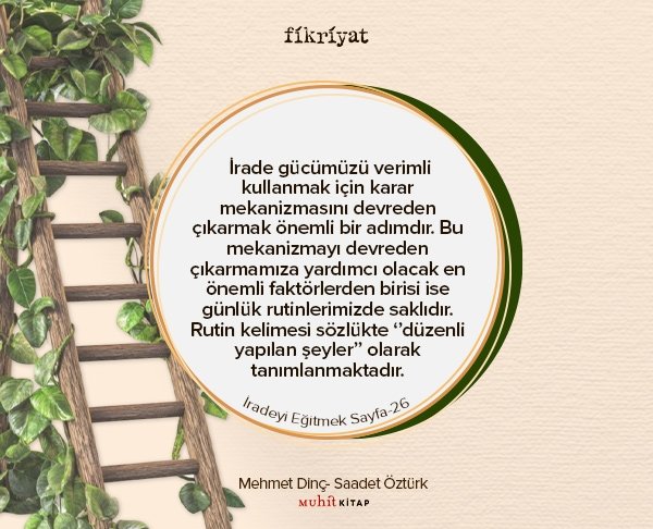"İrade gücümüzü verimli kullanmak için karar mekanizmasını devreden çıkarmak önemli bir adımdır. Bu mekanizmayı devreden çıkarmamıza yardımcı olacak en önemli faktörlerden birisi ise günlük rutinlerimizde saklıdır. Rutin kelimesi sözlükte ''düzenli yapılan şeyler'' olarak tanımlanmaktadır."