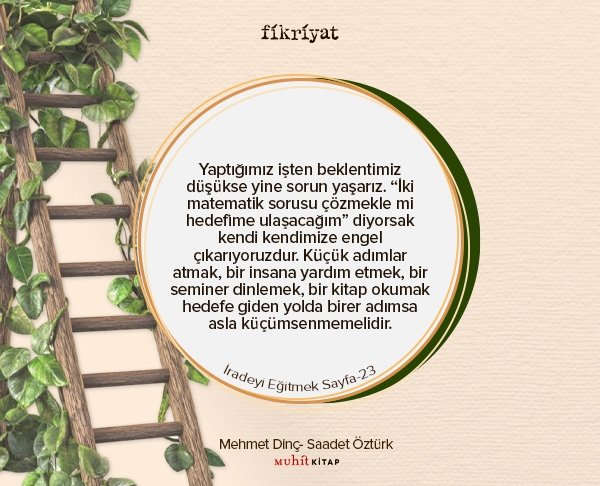 "Yaptığımız işten beklentimiz düşükse yine sorun yaşarız. "İki matematik sorusu çözmekle mi hedefime ulaşacağım" diyorsak kendi kendimize engel çıkarıyoruzdur. Küçük adımlar atmak, bir insana yardım etmek, bir seminer dinlemek, bir kitap okumak hedefe giden yolda birer adımsa asla küçümsenmemelidir."