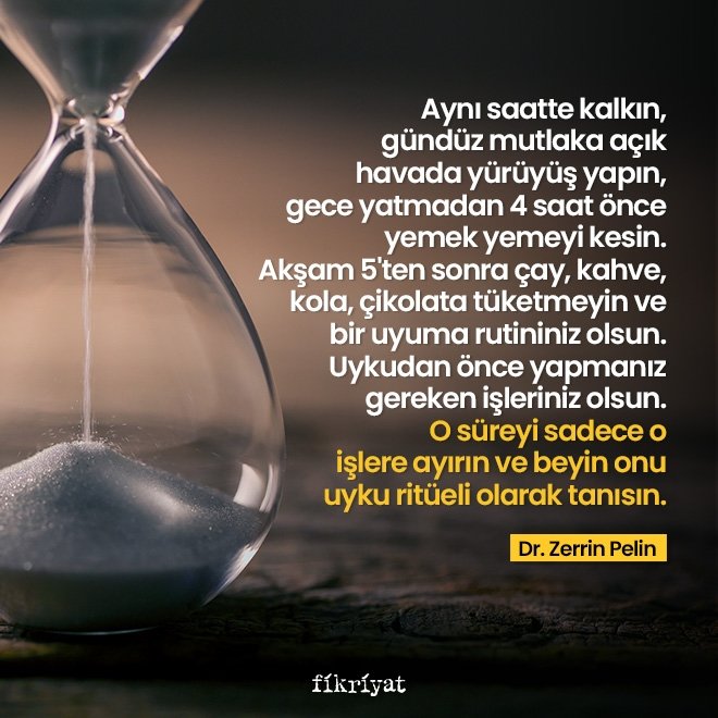 Aynı saatte kalkın, gündüz mutlaka bir açık havada yürüyüş yapın, akşam gece yatmadan 4 saat önce yemek yemeyi kesin. Akşam 5'ten sonra çay, kahve, kola, çikolata tüketmeyin ve bir uyuma rutininiz olsun. Uykudan önce yapmanız gereken işleriniz olsun. O süreyi sadece o işlere ayırın ve beyin onu uyku ritüeli olarak tanısın.