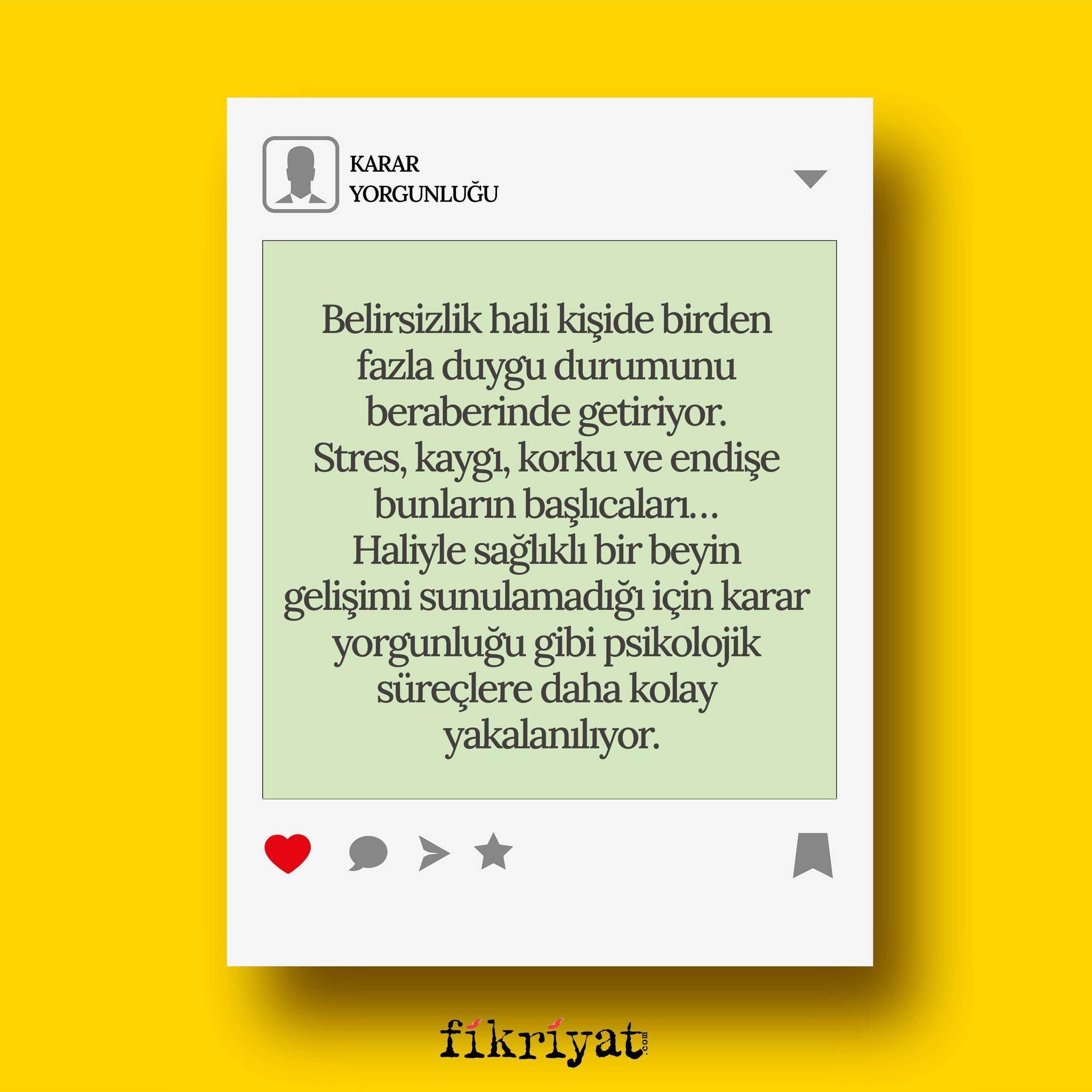 ➡ İşte burada karar verme süreçlerini etkileyen nedenlerin içinde belirsizlik hali önemli bir rol oynar. Belirsizlik hali kişide birden fazla duygu durumunu beraberinde getiriyor. Stres, kaygı, korku ve endişe bunların başlıcaları… Haliyle sağlıklı bir beyin gelişimi sunulamadığı için karar yorgunluğu gibi psikolojik süreçlere daha kolay yakalanılıyor.