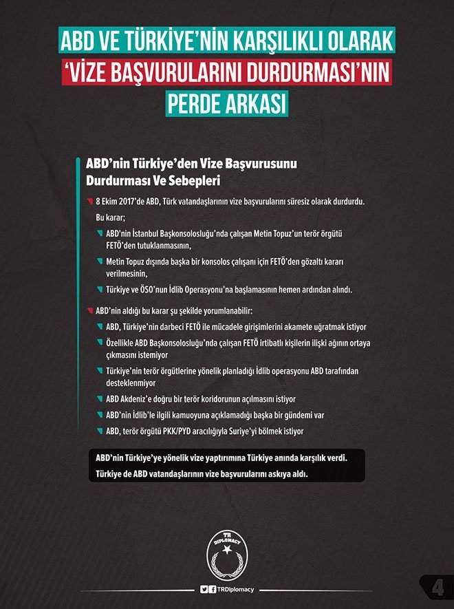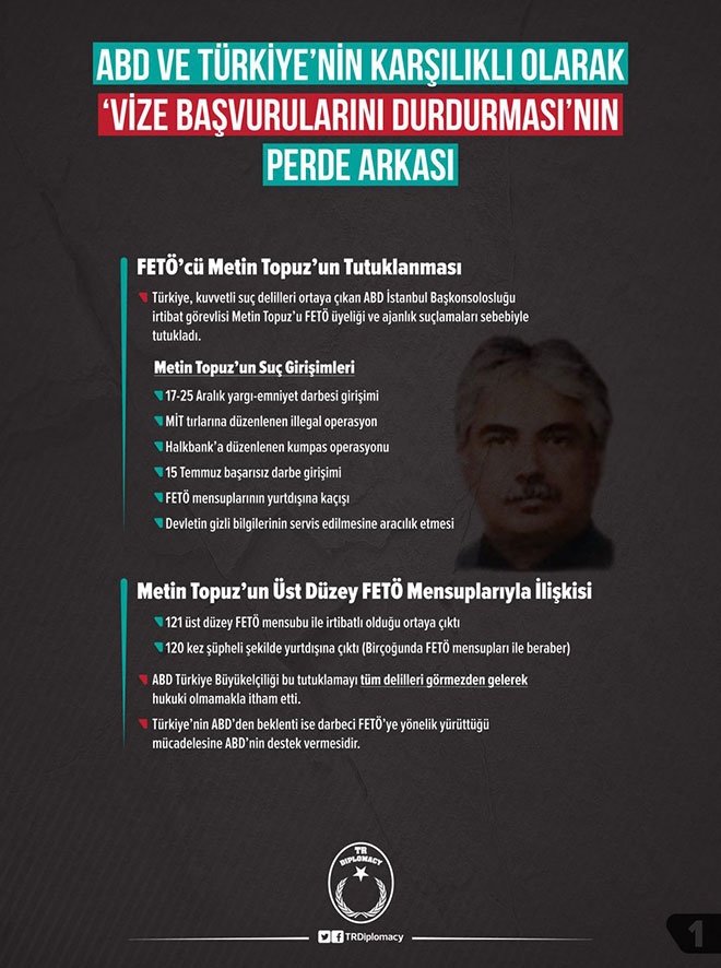 ABD, 8 Ekim 2017'de Türk vatandaşlarının vize başvurularını süresiz olarak durdurdu. Bu karar, ABD'nin İstanbul Başkonsolosluğu'nda çalışan Metin Topuz'un terör örgütü FETÖ'den tutuklanmasının, Metin Topuz dışında başka konsolos çalışanı için FETÖ 'den gözaltı kararı verilmesinin, Türkiye ve ÖSO'nun İdlib Operasyonu'na başlamasının hemen ardından alındı.