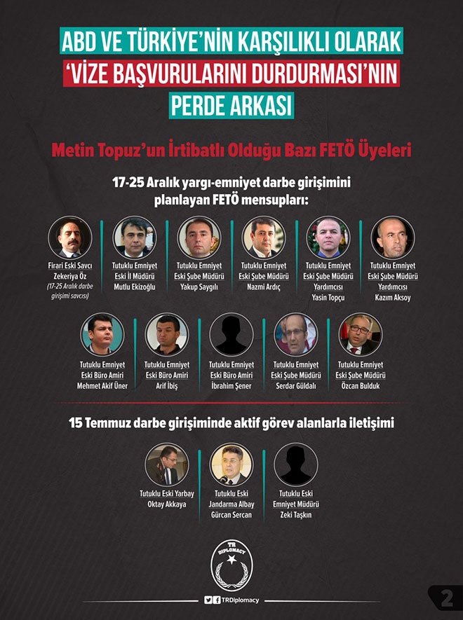 Türkiye kuvvetli suç delilleri ortaya çıkan ABD İstanbul Başkonsolosluğu irtibat görevlisi Metin Topuz'u FETÖ üyeliği ve ajanlık suçlamaları sebebiyle tutukladı. Topuz'un suç girişimleri içinde 17-25 Aralık yargı-emniyet darbesi girişimi, MİT tırlarına düzenlenen illegal operasyon, Halkbank'a düzenlenen kumpas operasyonu, 15 Temmuz başarısız darbe girişimi, FETÖ mensuplarının yurtdışına kaçışı, devletin gizli bilgilerinin servis edilmesine aracılık etmesi, bulunuyor.