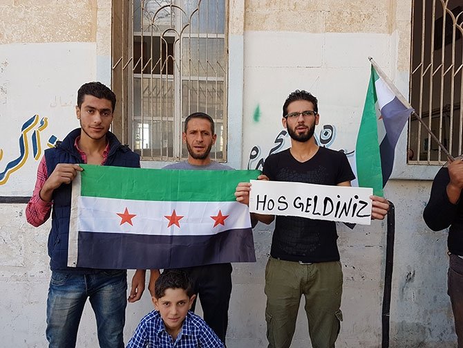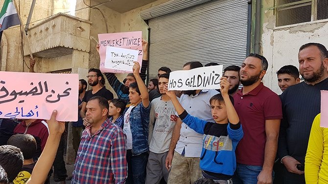 Ellerinde Özgür Suriye Ordusu (ÖSO) bayrakları ve "Daret İzze'ye hoş geldiniz", "Fatihin torunları ülkenize hoş geldiniz", "Suriye halkını koruduğunuz için teşekkür ederiz", "Memleketinize hoş geldiniz" şeklinde Türkçe ve Arapça yazılı pankartlar taşıyan göstericiler, "Merhaba Türk kardeşlerimiz, kahrolsun PKK", "Türk kardeşlerimiz hoş geldiniz" sloganları attı.