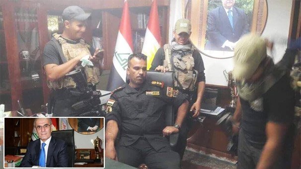 Valinin odasına giren Irak askerleri binadaki IKBY bayrağını indirdi. Daha sonra askerler, görevden alınmasına rağmen koltuğunu bırakmayan valinin makam odasında poz verdi.