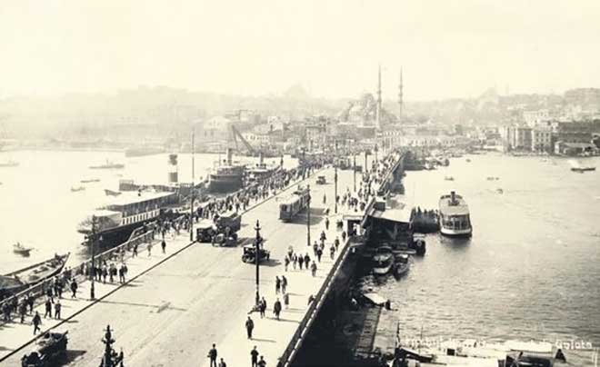 Galata Köprüsü'nde Otomobil ve Tramvay.