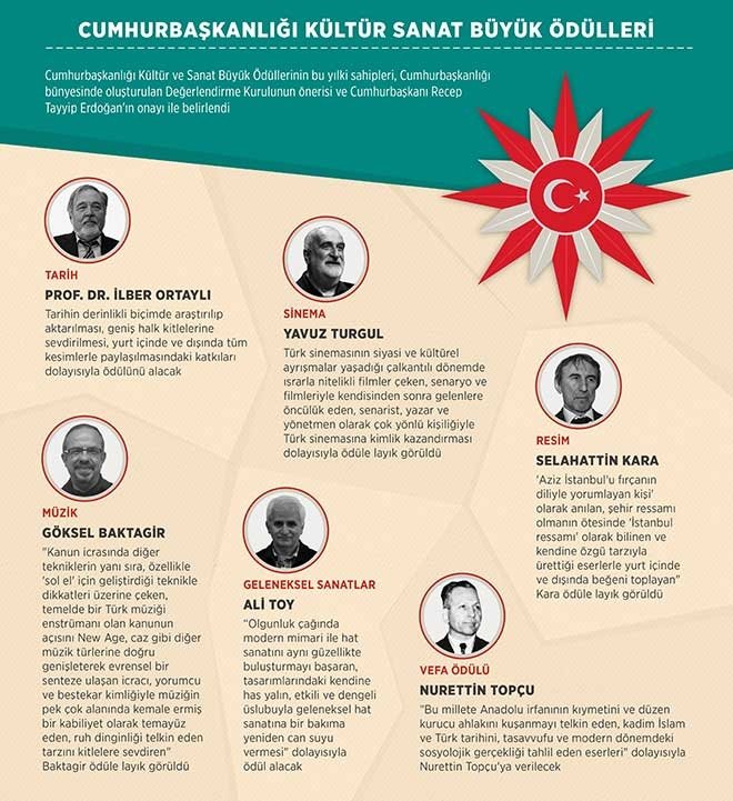 Cumhurbaşkanlığı Kültür ve Sanat Büyük Ödüllerinin bu yılki sahipleri, Cumhurbaşkanlığı Genel Sekreteri Fahri Kasırga, Cumhurbaşkanlığı Sözcüsü Doç. Dr. İbrahim Kalın, Cumhurbaşkanlığı Basın Başdanışmanı Lütfullah Göktaş, Cumhurbaşkanlığı Kurumsal İletişim Başkanı Dr. Mücahit Küçükyılmaz, Cumhurbaşkanlığı Danışmanı Hümeyra Şahin, Kültür ve Turizm Bakanlığı Müsteşarı Ömer Arısoy, Yunus Emre Enstitüsü Başkanı Prof. Dr. Şeref Ateş ile Yazar Alev Alatlı ve Yazar Rasim Özdenören'den oluşan Değerlendirme Kurulunun önerisi ve Cumhurbaşkanı Recep Tayyip Erdoğan'ın onayı ile belirlendi.