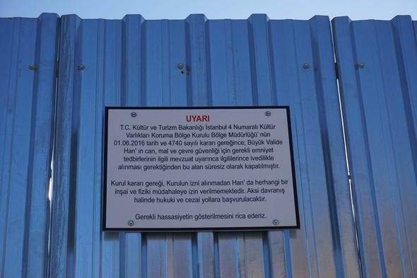 Muhteşem boğaz manzarası nedeniyle, sosyal medya paylaşım sitelerine fotoğraf koyanların vazgeçilmez mekanı haline gelen Büyük Valide Han'ın girişine Turizm Bakanlığı tarafından asılan uyarı levhasında "Can, mal ve çevre güvenliği açısından bu alan süresiz olarak kapatılmıştır" yazıyor.