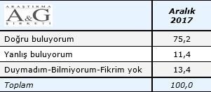 A&G Araştırma Şirketi'nin 23-25 Aralık tarihleri arasında Türkiye'nin 42 şehrinde gerçekleştirdiği ankette, Cumhurbaşkanı Erdoğan'ın Kudüs politikasına halkın %75'inin destek verdiği ortaya çıktı. Halkın büyük bir bölümünün destek verdiği Kudüs politikasını desteklemediğini belirtenlerin oranı ise %11,4'te kaldı.