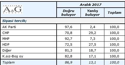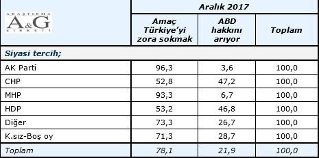 AK Parti'ye oy veren seçmenin %96,3'ü ABD'deki davaların amacının Türkiye'yi zora sokmak olduğu yönünde fikir beyan ederken bu görüşe destek MHP tabanında %93,3, CHP tabanında %52'8, MHP tabanında ise %93,3 olarak görülüyor.