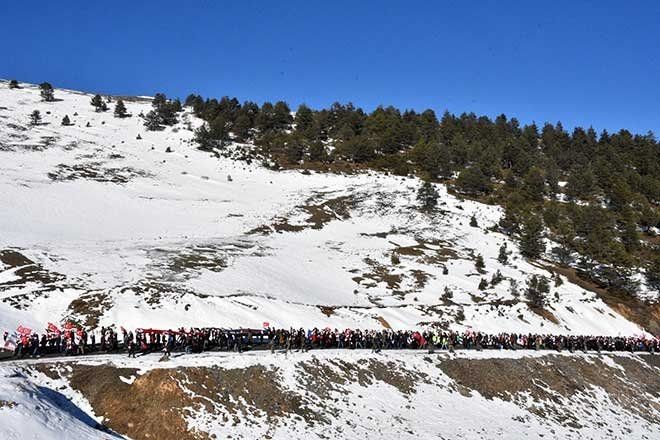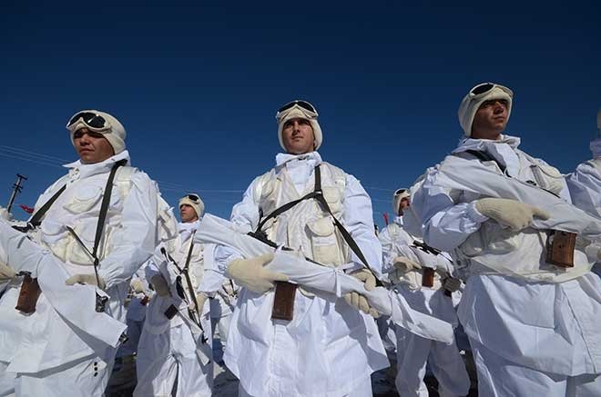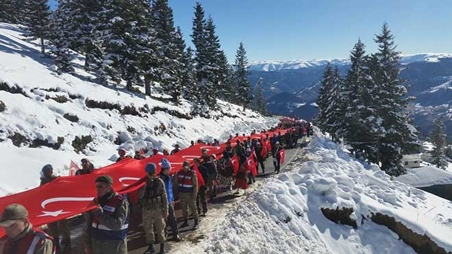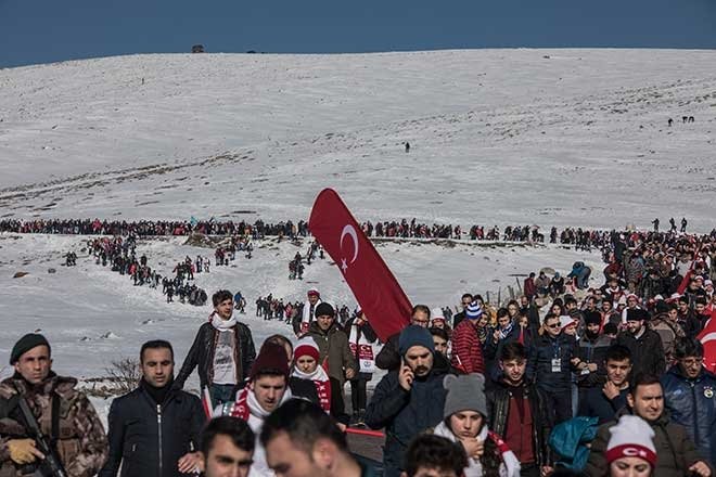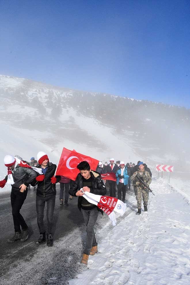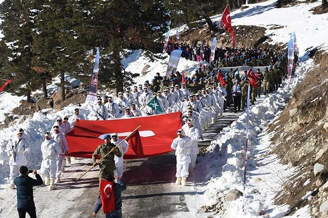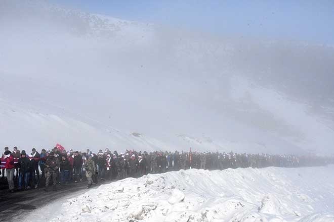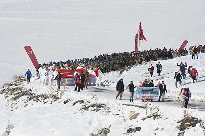 Soğuk havaya rağmen komando timlerinin de aralarında bulunduğu binlerce kişi, ellerinde Türk bayraklarıyla tekbir ve salavatlar getirerek Yukarı Sarıkamış Şehitliği'ne yürüyüşe geçti.