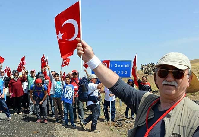 Caminin önünde toplanan, 103 metre uzunluğundaki Türk bayrağını taşıyan grup, "Şehitler ölmez, vatan bölünmez" sloganları eşliğinde yürüdü.