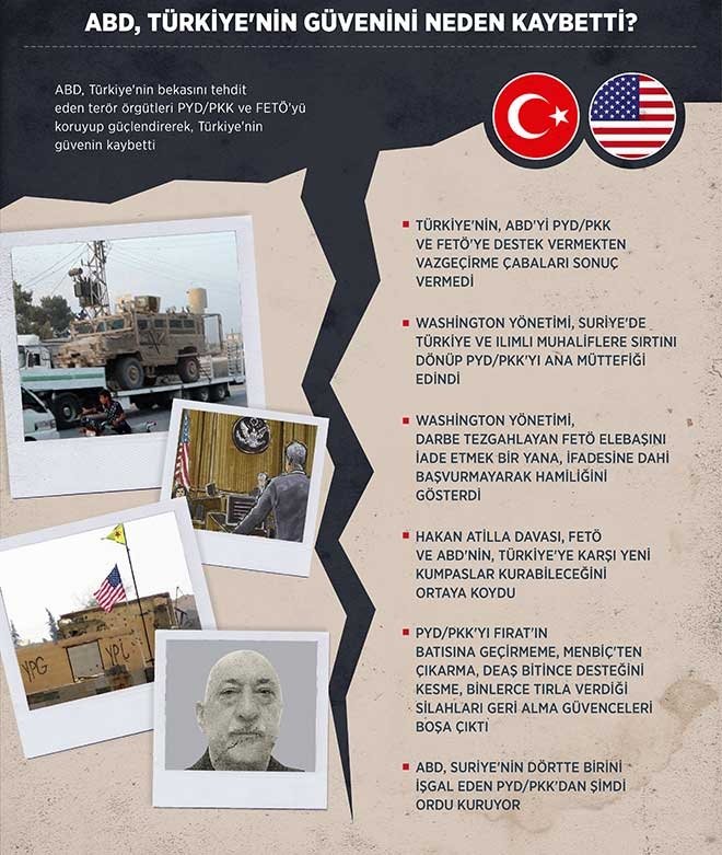 ABD, Türkiye'nin bekasını tehdit eden terör örgütleri PYD/PKK ve FETÖ'yü koruyup güçlendirerek, Türkiye'nin güvenini kaybetti. Türkiye'nin eğittiği Suriyeli ılımlı muhaliflere sırtını dönen ABD, Suriye'nin dörtte birini PYD/PKK'ya kazandırdı. ABD, darbe tezgahlayan FETÖ elebaşının hamiliğini üstlenirken, bu örgütün Türkiye'ye yönelik yeni kumpaslarına alet oluyor.