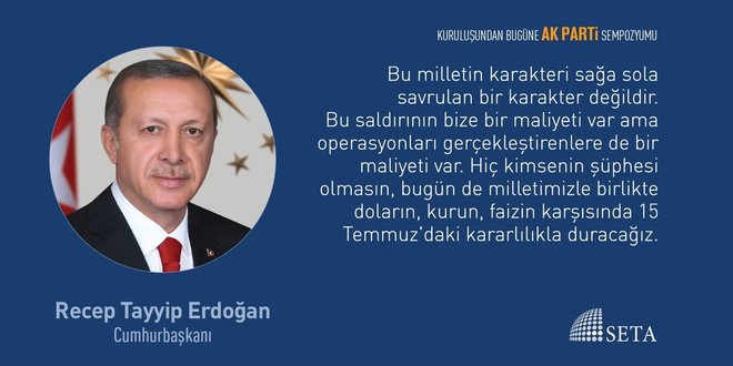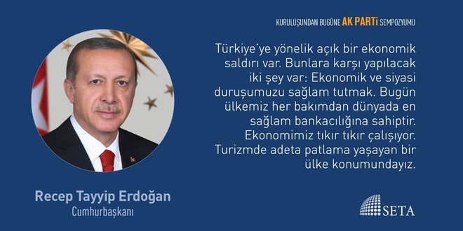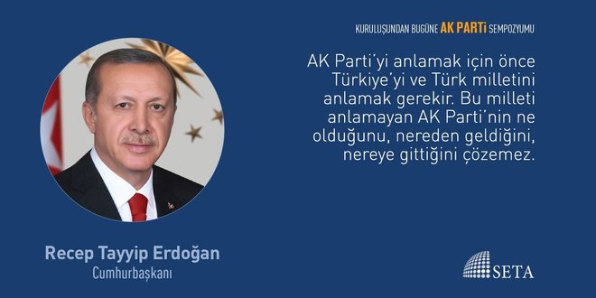 Kuruluşundan bugüne AK Parti sempozyumununun başarıyla geçmesini diliyorum. Bu kapsamlı toplantı için SETA yöneticilerini tebrik ediyorum. AK Parti yönetimini anlamanın bugünlerde daha önemli olduğunu düşünüyorum. AK Parti'nin Türkiye'de gerçekleştirdiği büyük dönüşümün tartışılacak olmasını çok çok önemli görüyorum. SETA yayınladığı 4 ayrı kitap ile tartışmanın zeminini zaten oluşturmuştur.