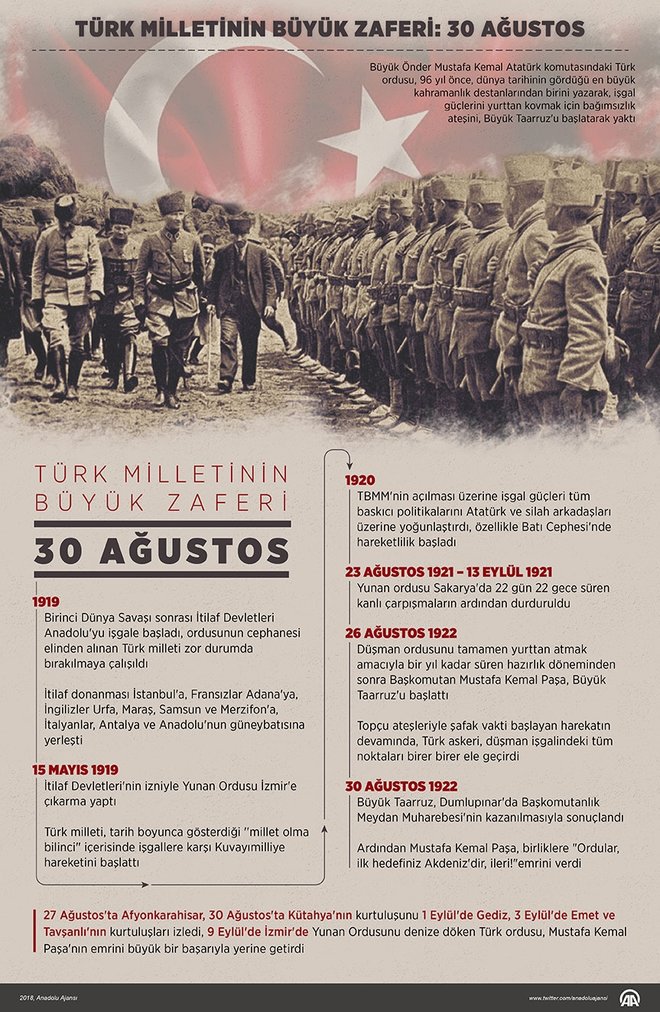 Mustafa Kemal Paşa komutasındaki Türk Ordusu 96 yıl önce bugün dünyanın en büyük kahramanlık destanlarından birinin yazıldığı Büyük Taarruz'u başlattı. 1919 yılında Birinci Dünya Savaşı sonrası İtilaf Devletleri, Mondros Ateşkes Antlaşması hükümlerine dayanarak türlü bahanelerle Anadolu'yu işgale başladı, ordusunun cephanesi elinden alınan Türk milleti zor durumda bırakılmaya çalışıldı.