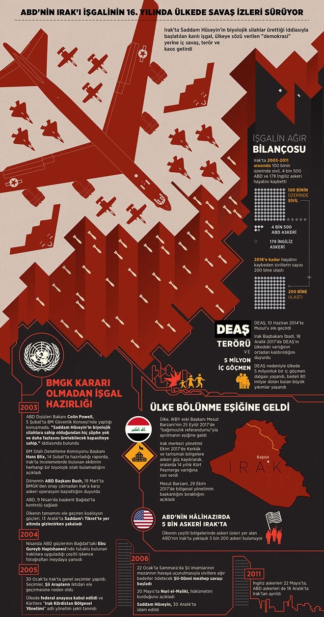 ABD ve İngiltere öncülüğündeki koalisyon güçlerince Irak işgalinin üzerinden 16 yıl geçse de, ülkede savaşın izleri sürüyor. Saddam Hüseyin'in biyolojik silahlar ürettiği iddiasıyla başlatılan kanlı işgal, ülkeye sözü verilen "demokrasi" yerine iç savaş, terör ve kaos getirdi.