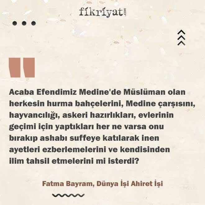 Acaba Efendimiz Medine'de Müslüman olan herkesin hurma bahçelerini, Medine çarşısını, hayvancılığı, askeri hazırlıkları, evlerinin geçimi için yaptıkları her ne varsa onu bırakıp ashabı suffeye katılarak inen ayetleri ezberlemelerini ve kendisinden ilim tahsil etmelerini mi isterdi? Bilginin dini olan ve olmayan diye ayrışmasının tabii bir bölünme olup olmadığını da düşünelim bu arada. Veya yaptığımız işlerin gerçekte dünya ve ahiret işleri diye keskin bir şekilde ayrışıp ayrışmadığını.