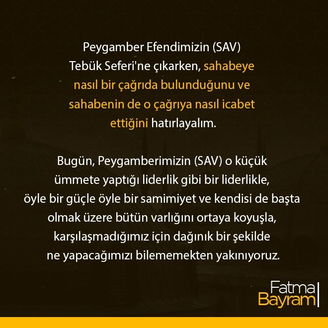 Özellikle böyle kriz anlarında, kırkta biri vermekle yetinmeden, -biliyorsunuz o normal şartlardaki zekatın miktarıdır- herkes elinde ne varsa getirmelidir. Siyeri bunun için okumuş olmalıyız. Her yerde atölyeler, dersler, eğitimler veriliyor. Bunlar günlük hayatta bir krizle karşı karşıya geldiğimizde hatırlanmayacaksa, hiçbir işe yaramıyor demektir. Peygamber Efendimizin (SAV) Tebük Seferi'ne çıkarken, sahabeye nasıl bir çağrıda bulunduğunu ve sahabenin de o çağrıya nasıl icabet ettiğini hatırlayalım. Bugün, Peygamberimizin (SAV) o küçük ümmete, topluluğa yaptığı liderlik gibi bir liderlikle, samimiyet ve kendisi de başta olmak üzere bütün varlığını ortaya koyuşla karşılaşmadığımız için belki de dağınık bir şekilde, ne yapacağımızı bilememekten yakınıyoruz.