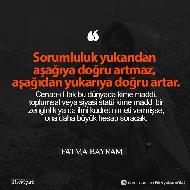 Bu konuda kendi çevreme, konuşabildiğim, ulaşabildiğim insanlara dikkat ediyorum. Genellikle elinde kayda değer bir güç olmayan kardeşlerimiz daha yüksek ve kuvvetli sorumluluk duyuyorlar. Uykuları kaçıyor, sokaklarda geziyorlar. Ne yapabiliriz diye düşünüyorlar, ağlıyorlar. Küçük stickerları kendi bilgisayarlarında üretip, yapıştırmak gibi; kendi ürettikleriyle küçük hayır çarşıları düzenlemek gibi faaliyetlere katılmaya çalışıyorlar. Ama aslında arkadaşlar sorumluluk yukarıdan aşağıya doğru artmaz, aşağıdan yukarıya doğru artar. Yani, Cenab-ı Hak bu dünyada kime maddi zenginlik, siyasi statü, kanaat önderliği veya ilmi kudret gibi bir nimet vermişse, ona daha büyük hesap soracak, bunu biliyoruz.