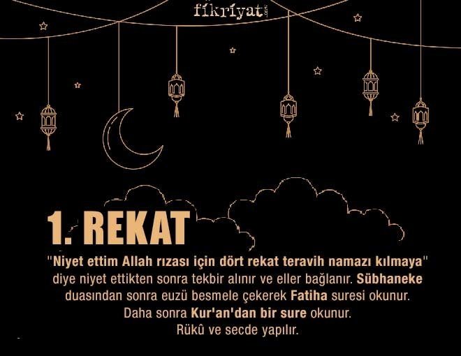 "Niyet ettim Allah rızası için dört rekat teravih namazı kılmaya" diye niyet ettikten sonra tekbir alınır ve eller bağlanır.