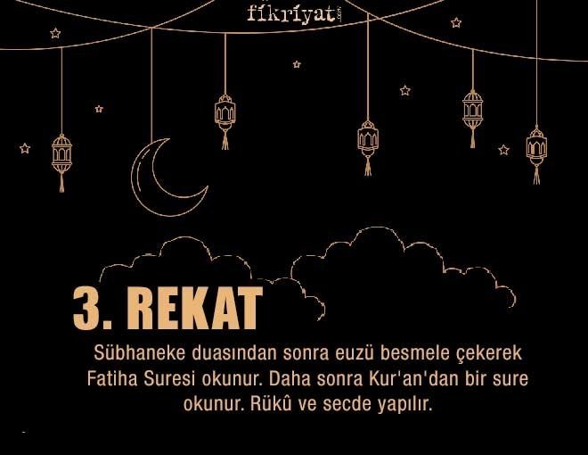 ◾ ▪ ◽ Cemaat halinde kılınan teravihin üçüncü rekatında imam ve cemaat "Sübhaneke" duasını okur. Ardından sadece imam euzü besmele, Fatiha ve Kur'an'dan bir sure okur. Rükû ve secdenin ardından dördüncü rekâta kalkılır.