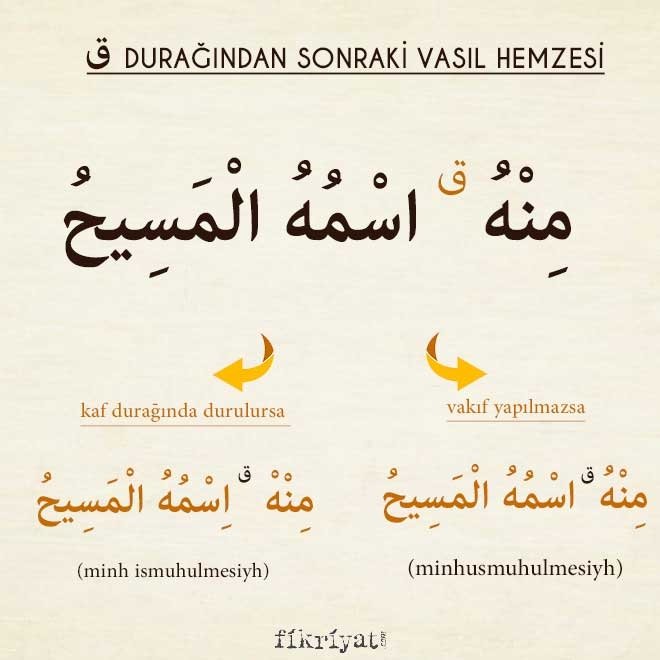 ❗ Aynı durum مِنْهُ ق اسْمُهُ الْمَسِيحُ örneğinde de söz konusudur. İki kelime arasında kaf durağına bakılmaksızın geçiş yapılırsa "minhusmuhulmesiyh" şeklinde okunur.