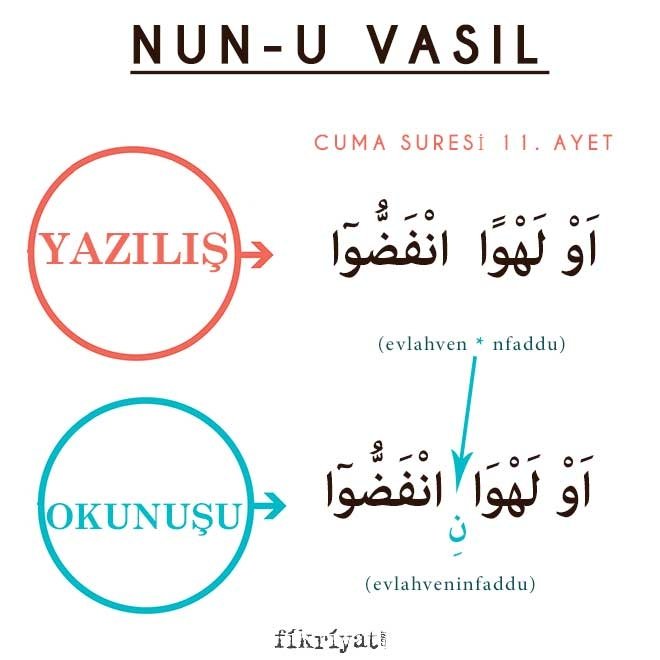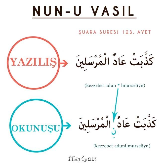📌 Kur'an-ı Kerim'in tilaveti esnasında bazen sonu tenvin ile biten ve ardından elifle başlayan iki kelime arasında hafifçe altta yazılmış küçük bir ن (nun) harfi görürüz. Bu harf tenvinle biten ve vasıl hemzesi başlayan kelimelerin arasındaki geçişi kolaylaştırmak için konulmuştur.