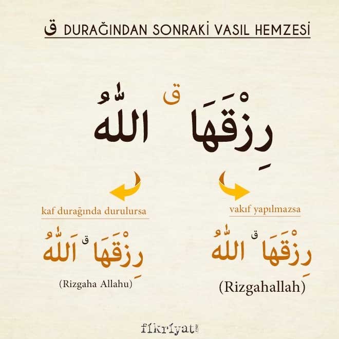 ❗Kur'an-ı Kerim'de رِزْقَهَا ق اللّٰهُ örneğinde olduğu gibi bazı kelimelerde ق (kaf) durağından sonra vasıl hemzesi yer almaktadır. Bu durumda şayet iki kelime arasında vakıf yapılmadan geçilirse "Allah" kelimesindeki elif okunmaz. Yani iki kelime "rizgahallah" şeklinde okunur.