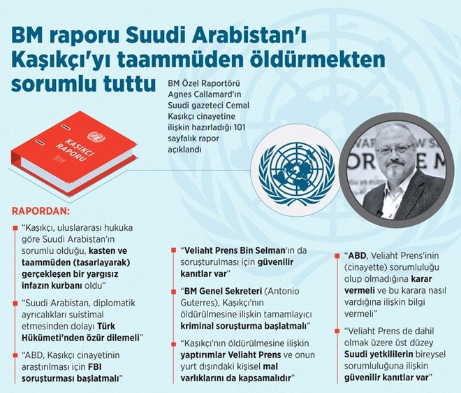 Suudi gazeteci Cemal Kaşıkçı cinayetine yönelik aylardır uluslararası soruşturma yürüten Birleşmiş Milletler (BM) Yargısız ve Keyfi İnfazlar Özel Raportörü Agnes Callamard, elde ettiği bulguları ve tavsiyeleri içeren raporunu dün açıkladı. Rapor, tüm dünya basınında büyük yankı uyandırdı.