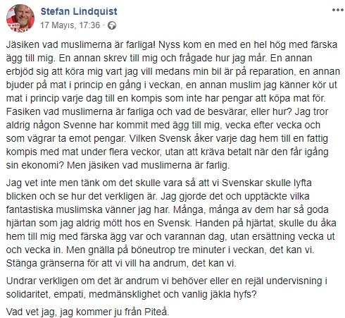 Makalesinde Müslümanlar ile İsveçlileri karşılaştıran Lindquist, ''Bir İsveçlinin para almadan birine yumurta vereceğine kesinlikle inanmıyorum. Hangi İsveçli parası olmayan arkadaşının evine haftalarca yemek götürür? Müslümanlar, sahiden de çok tehlikeli.'' ifadesine yer verdi.