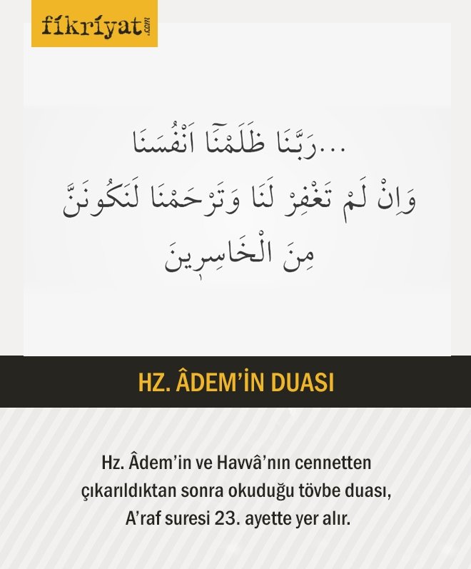 Hz. Âdem'in ve Havvâ'nın cennetten çıkarıldıktan sonra okuduğu tövbe duası, A'raf suresi 23. ayette yer alır.