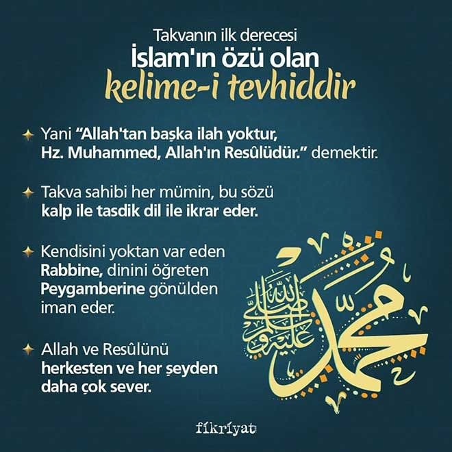 Kıymetli Müslümanlar! Takvanın ilk derecesi, İslam'ın özü olan kelime-i tevhiddir. Yani "Allah'tan başka ilah yoktur, Hz. Muhammed, Allah'ın Resûlüdür." demektir. Takva sahibi her mümin, bu sözü kalp ile tasdik dil ile ikrar eder. Kendisini yoktan var eden Rabbine, dinini öğreten Peygamberine gönülden iman eder. Allah ve Resûlünü herkesten ve her şeyden daha çok sever.
