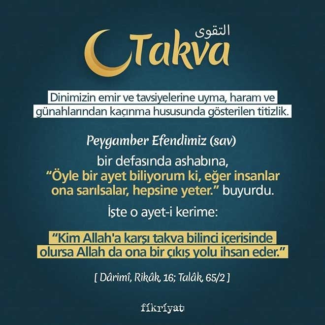 "Kim Allah'a karşı takva bilinci içerisinde olursa Allah da ona bir çıkış yolu ihsan eder." (Dârimî, Rikâk, 16; Talâk, 65/2)