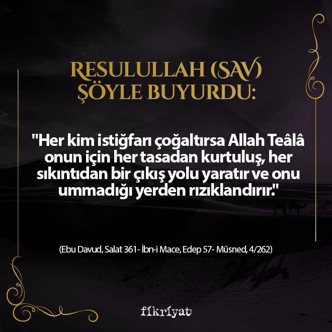 "Her kim istiğfarı çoğaltırsa Allah Teâlâ onun için her tasadan kurtuluş, her sıkıntıdan bir çıkış yolu yaratır ve onu ummadığı yerden rızıklandırır"
