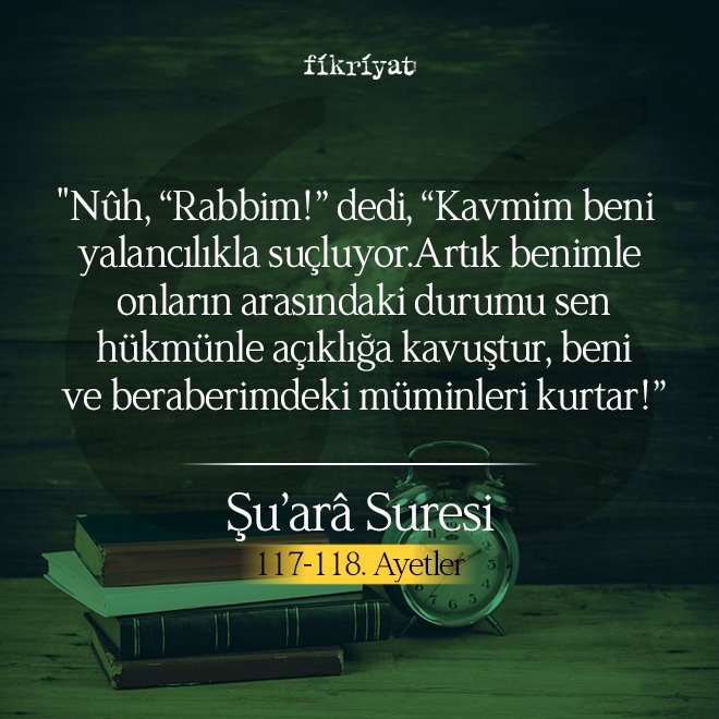 "Nûh, "Rabbim!" dedi, "Kavmim beni yalancılıkla suçluyor. Artık benimle onların arasındaki durumu sen hükmünle açıklığa kavuştur, beni ve beraberimdeki müminleri kurtar!"