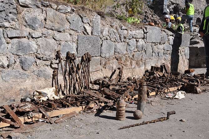 Müze Müdürlüğü görevlileri nezaretinde yapılan kazı çalışmalarında ortaya çıkan ve 1828 Osmanlı-Rus Savaşı'ndan kalan Türk ve Rus Süngüleri, Top Mermileri, Gülle, kurşun kovanı ve buna benzer malzemeler bir arada toplanıyor.