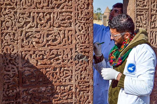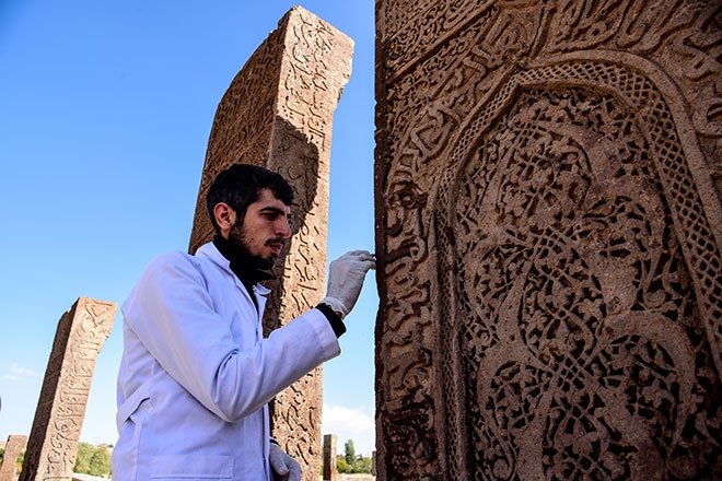 "Dünyanın hiçbir yerinde 4 metre yüksekliğinde ve tek parça taştan yapılmış, 1-1,5 metresi yerin altına kadar giden böyle devasa taşlara rastlanmıyor. Bunların üzerindeki süslemeler çok önemli. Selçuklular döneminde Karatay Medresesi'nde, Sırçalı Medresesi'nde, Kubadabad Sarayı'nda, Divriği Ulu Cami'de, Kayseri'deki yapılarda gördüğünüz tüm süslemeleri burada görebiliyoruz. Geometrik süslemeler, palmetler, ejderha başları, bunların hepsi Ahlat Selçuklu Mezarlığı'nda görülüyor. Bu yüzden taşların korunması çok önemli."