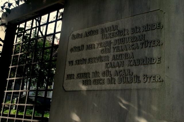 Yahya Kemal'in mezar taşında, vasiyeti üzerine Rindlerin Ölümü şiirinin ikinci kıtası yazıyor.