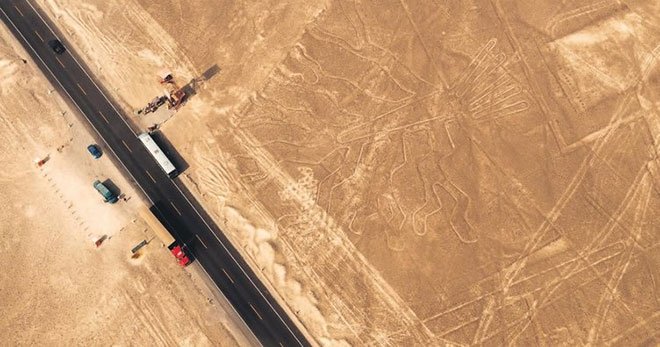 Bu ilginç insan yapımı çizgiler 'Nazca çizgileri' olarak bilinirler ve Peru'nun başkenti Lima'dan 450 km uzakta Nazca ve Palpa şehirleri arasındaki çölde ortalama olarak 450 km2 bir alana yayılmışlardır. Bölgede 800'den fazla düz çizgi, 300'den fazla geometrik figür ve 70'ten fazla hayvan ve bitki resmi mevcuttur. En büyük şekil 370 m uzunluğuna ulaşırken, düz çizgiler 50 km'yi bulan mesafelere uzanabiliyor.