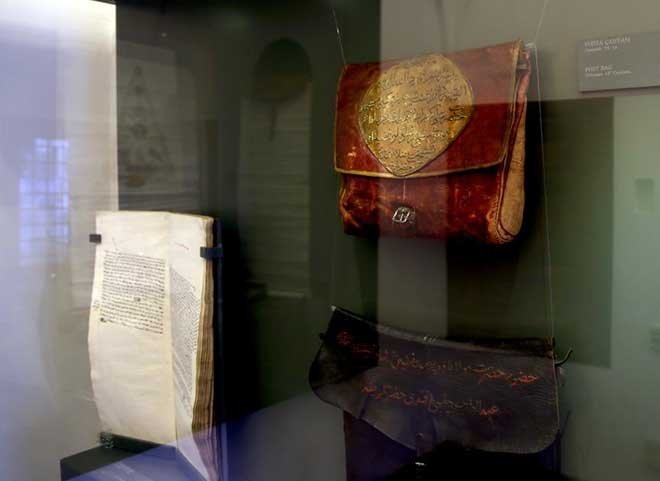 Anne tarafından Osmanlı halifesi, baba tarafından ise Hindistan şahının torunu olan Bereket Han tarafından müzeye bağışlanan ve kufi yazısıyla ceylan derisi üzerine yazılmış Kur'an-ı Kerim sayfaları dikkatle inceleniyor.