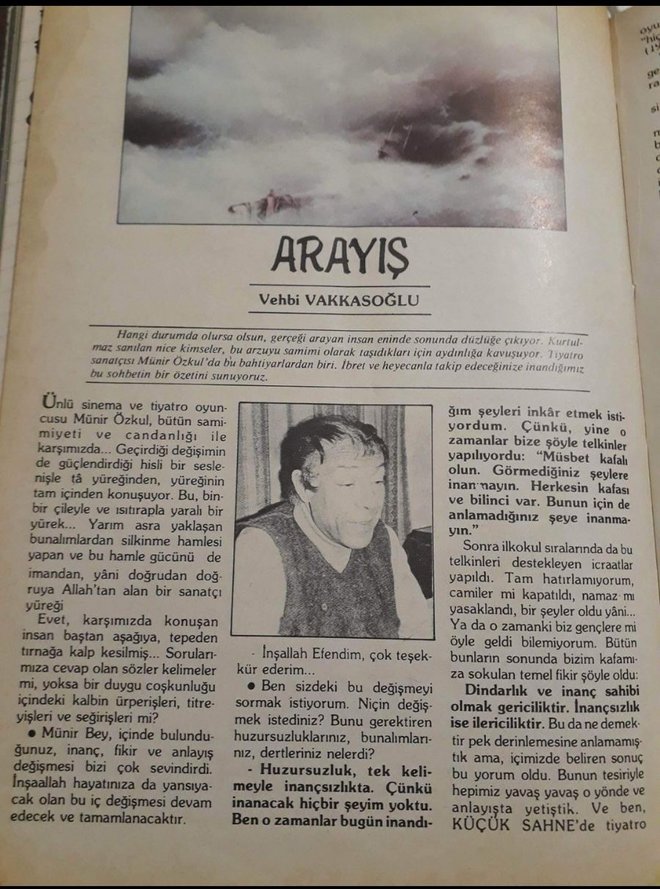 Vakkasoğlu'nun "Arayış" başlığını koyduğu Münir Özkul söyleşisini okuyucusuna şu cümlelerle takdim ediyor: "Hangi durumda olursa olsun, gerçeği arayan insan eninde sonunda düzlüğe çıkıyor. Kurtulmaz sanılan nice kimseler, bu arzuya samimi olarak taşıdıkları için aydınlığa kavuşuyor. Tiyatro sanatçısı Münir Özkul da bu bahtiyarlardan biri. İbret ve heyecanla takip edeceğinize inandığımız bu sohbetini sunuyoruz. Ünlü sinema ve tiyatro oyuncusu Münir Özkul, bütün cemiyeti ve candanlığı ile karşımızda… Geçirdiği değişimin de güçlendirdiği hisli bir sesleniş ta yüreğinden, yüreğinin tam içinden konuşuyor. Bu, binbir çileyle ve ıstırapla yaralı bir yürek… yarım asra yaklaşan bunalımlardan silkinme hamlesi yapan ve bu hamle gücünü de imandan, yani doğrudan doğruya Allah'tan alan bir sanatçı yüreği… Evet, karşımızda konuşan insan baştan aşağıya, tepeden tırnağa kalp kesilmiş…. Sorularımıza cevap olan sözler kelimeler mi, yoksa bir duygu coşkunluğu içindeki kalbin ürperişleri, titreyişleri ve seğirişleri mi?"