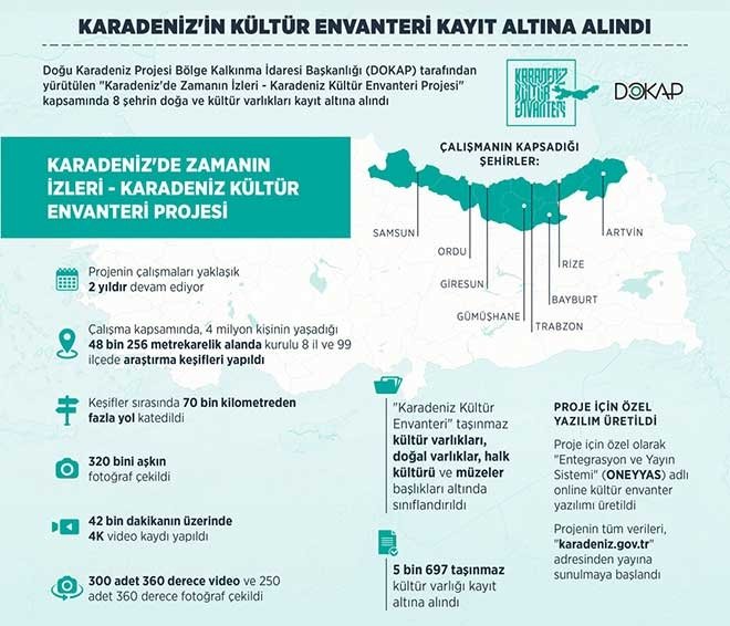Doğu Karadeniz Projesi Bölge Kalkınma İdaresi Başkanlığı (DOKAP) tarafından yürütülen "Karadeniz'de Zamanın İzleri - Karadeniz Kültür Envanteri Projesi" kapsamında 8 şehirdeki kültür varlıkları kayıt altına alındı. Konuya ilişkin yapılan açıklamaya göre, DOKAP bölgesindeki Artvin, Bayburt, Giresun, Gümüşhane, Ordu, Rize, Samsun, Trabzon şehirlerini kapsayan çalışma, konularında uzman akademisyen ve bilim adamlarının katkılarıyla araştırma, tespit, belgeleme (görsel, işitsel, yazılı), veri tabanına işleme ve raporlama şeklinde yürütüldü.