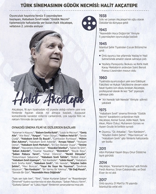 Oyunculuk hayatına henüz 5 yaşındayken başlayan, Hababam Sınıfı'ndaki "Güdük Necmi" tiplemesiyle hafızalarda yer bulan Halit Akçatepe, vefatının 2. yılında anılıyor.