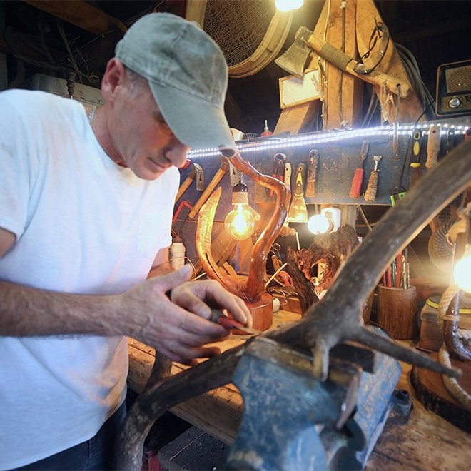 Boş vakitlerinde bahçesinin arka kısmında atıl ağaç parçalarını toplayan Temel, bunlardan lambader, masa lambası, çeşitli süs eşyaları ve dekoratif ürünler hazırladı. Ürünlerinin beğenilmesiyle evinin çatı katını atölyeye çeviren Temel, çivi ve vida kullanmadan yaptığı ürünleri sosyal medya hesabında satarak gelir elde ediyor.