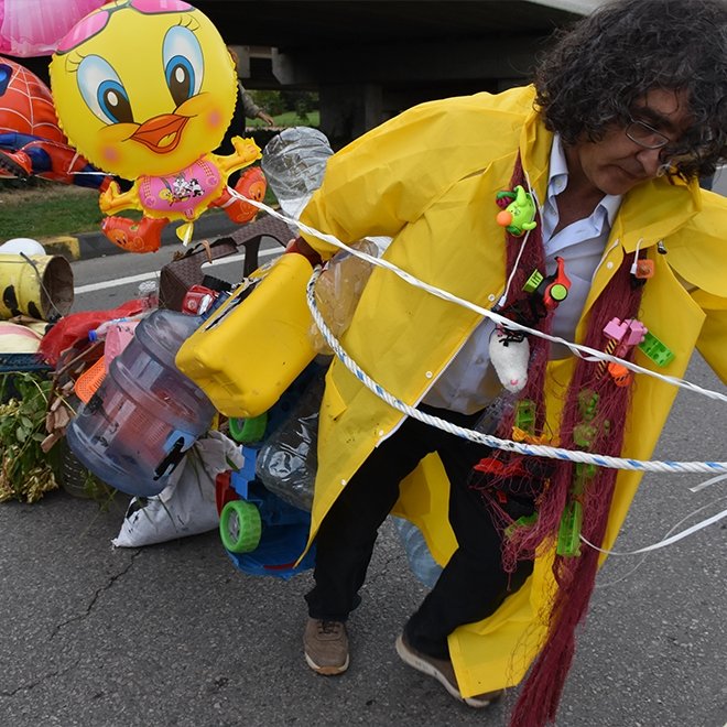 Kavukcu, performans öncesinde gazetecilere, atıklar üzerine tepki ve uyarı niteliğinde bir çalışma sergileyeceğini söyledi. Performanslarını şiddet, terör ve toplumsal olaylar üzerine yaptığını vurgulayan Kavukcu, "Yaklaşık 10 yıldır farklı performanslar sergiliyorum. Burada, özellikle düşünmeden biraz da bencilce kullandığımız, attığımız ve gittikçe çöp dağlarını oluşturduğumuz bir dünyada sanatçı olarak bir uyarı mahiyetinde görev bildiğim için kendi bildiğim dil olan sanatı kullandım." dedi.