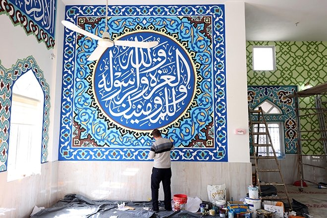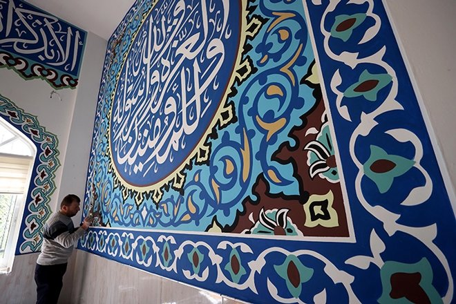 Filistinli hattat, yaklaşık bir ay süren aralıksız çalışmaları neticesinde caminin iç duvarlarını Kur'an-ı Kerim'den ayetler ve geleneksel İslam sanatlarına ait desenlerle süslediğini anlattı.