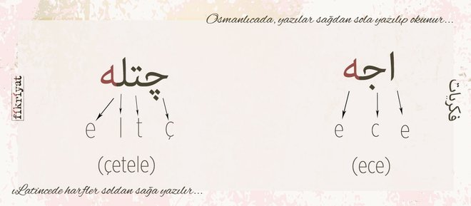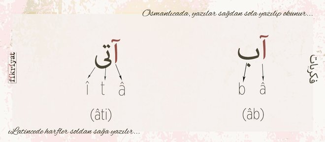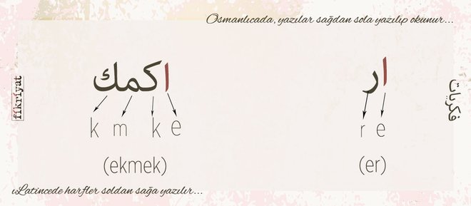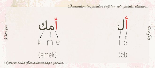 Burada medli elif harfinin kelime başında a sesini karşılaması "ak" ve "adım" kelimelerinin Osmanlı alfabesiyle yazımıyla gösterildi. Osmanlıcanın sağdan sola yazılıp okunurken Latincenin soldan sağa yazıldığı unutulmaması gereken en önemli husustur.